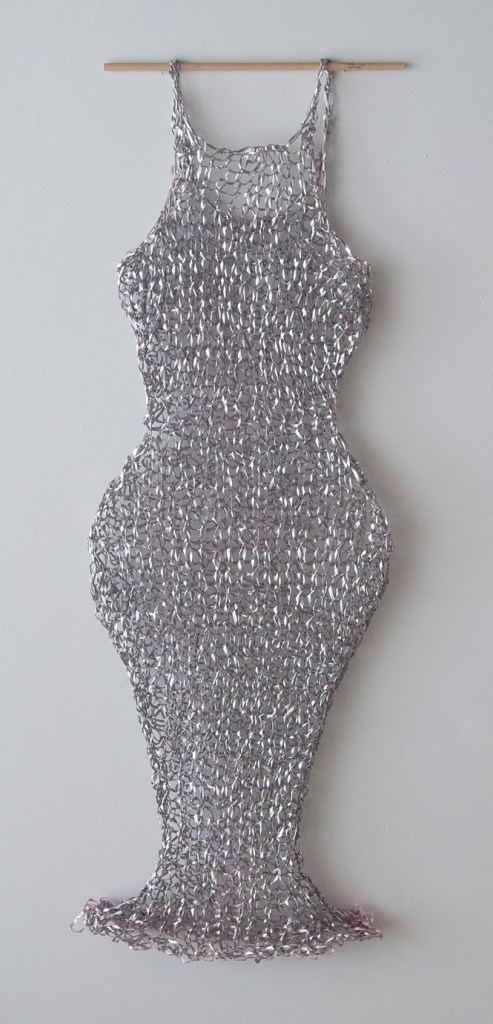 Chainmail Dress (12), 2011, Ribbon and silver spray paint, 53 x 18 in.