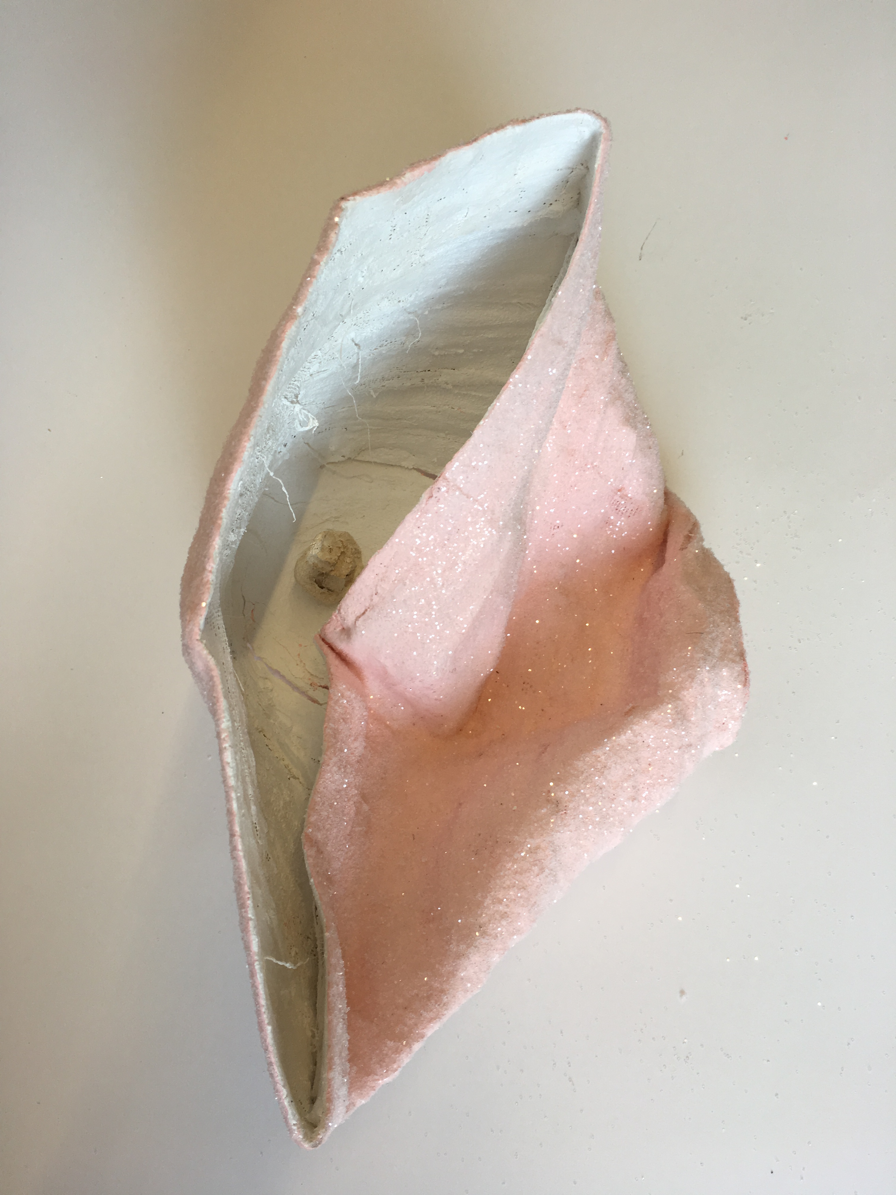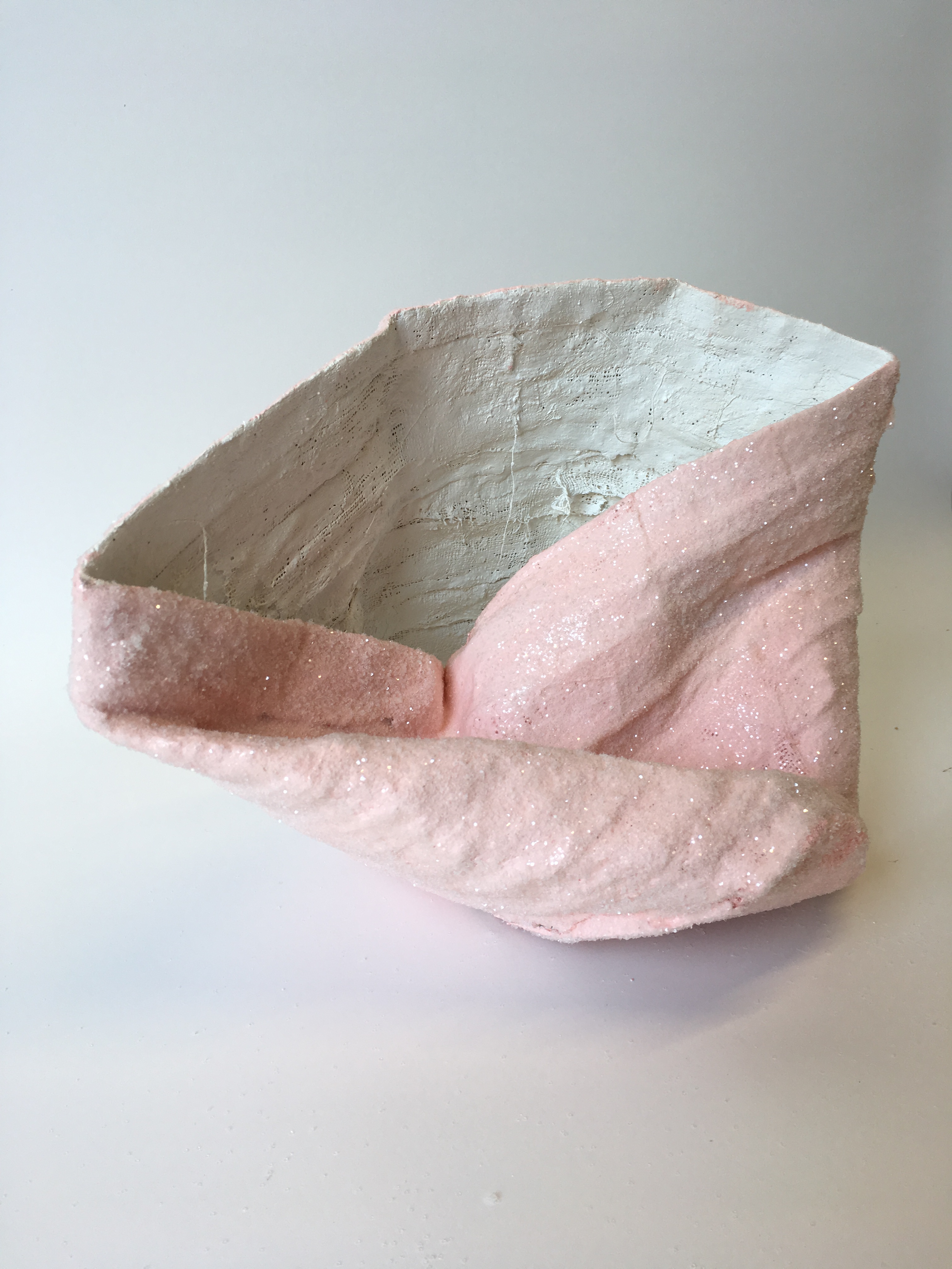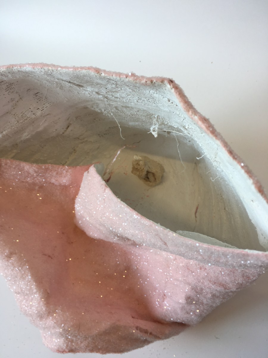 Jamal/Beauty (Syrian), 2019, Plaster bandages, newspaper, acrylic, glitter, 9 1/2h x 13 ¼ w x 10d inches
